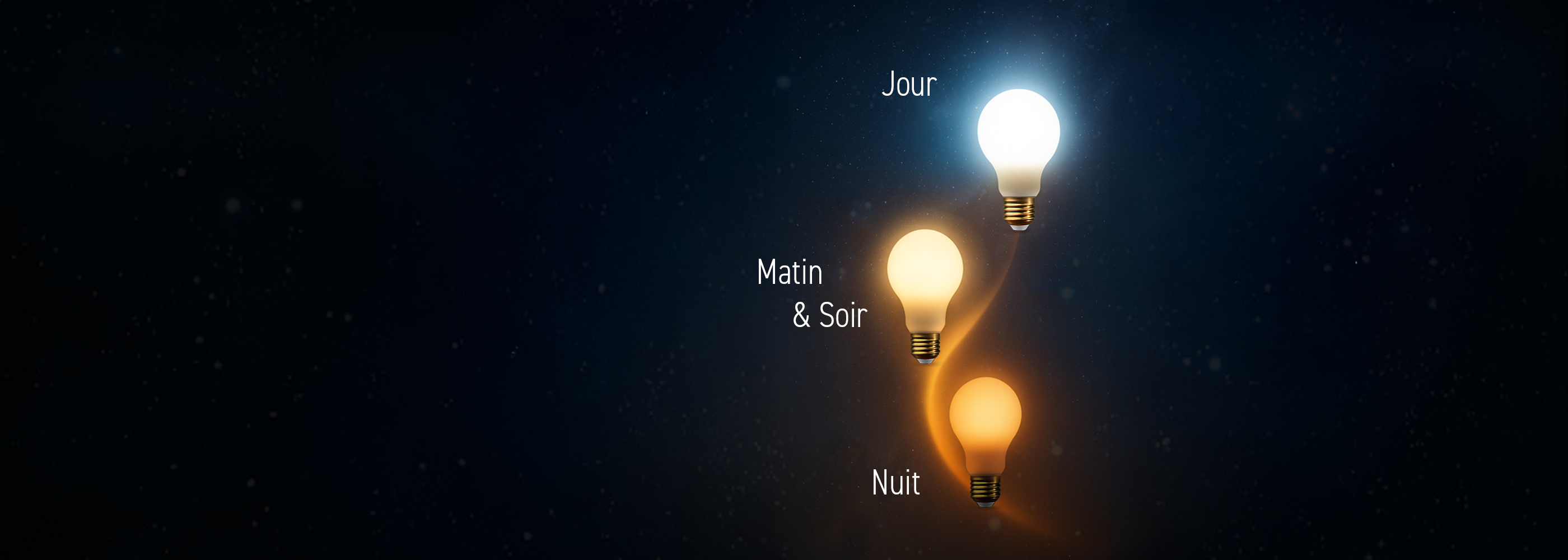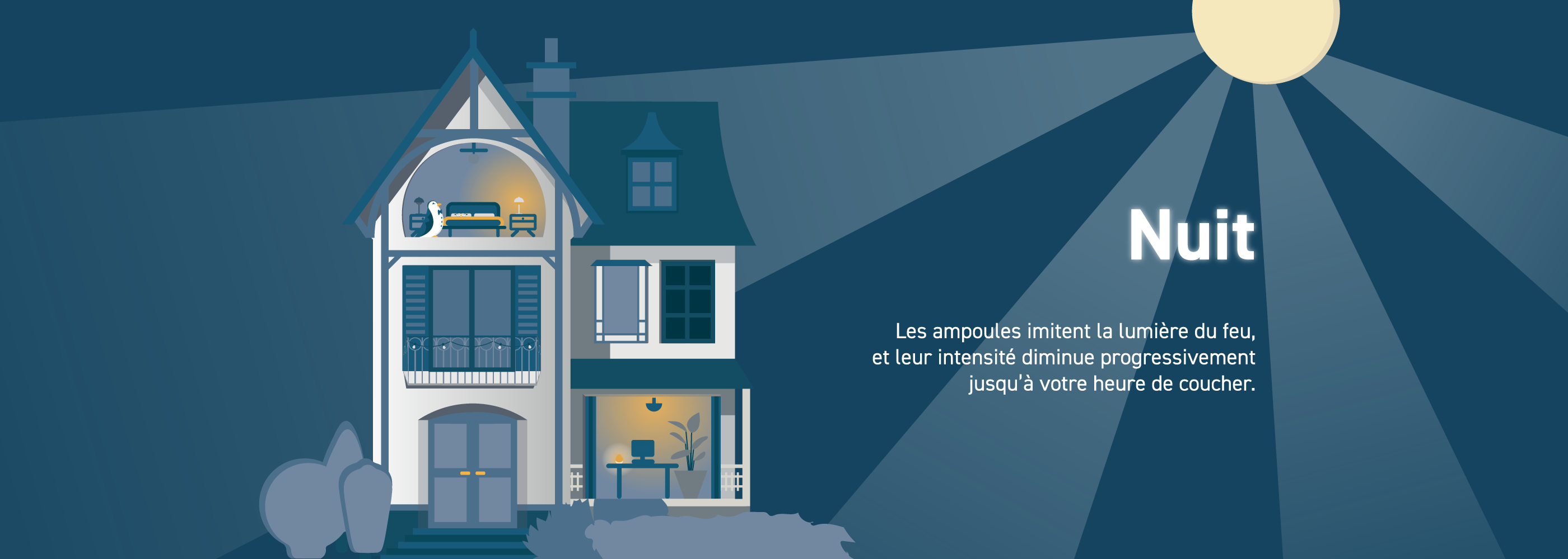 Les ampoules ajustent leur éclairage selon un cycle optimisé afin de favoriser la production de mélatonine (représentée par le point bleu) : un rythme circadien idéal pour la santé, le bien-être et la qualité du sommeil. Source : consensus scientifique publié en 2022 (PLOS Biology)